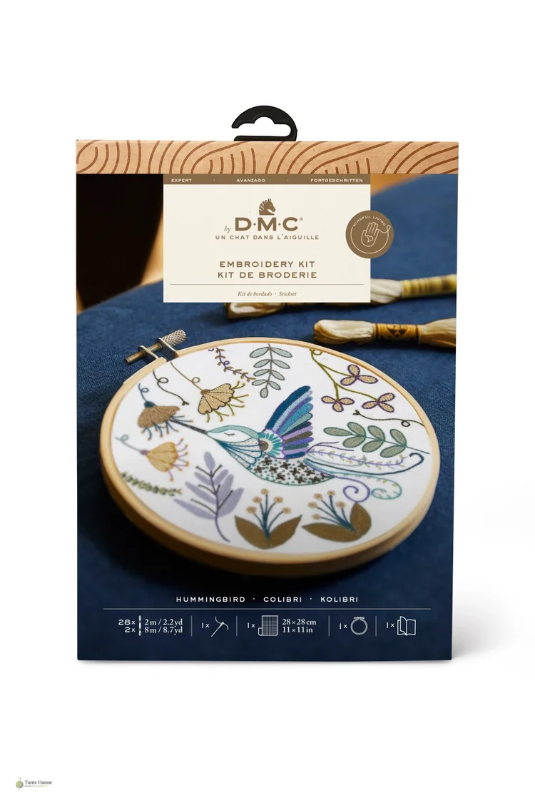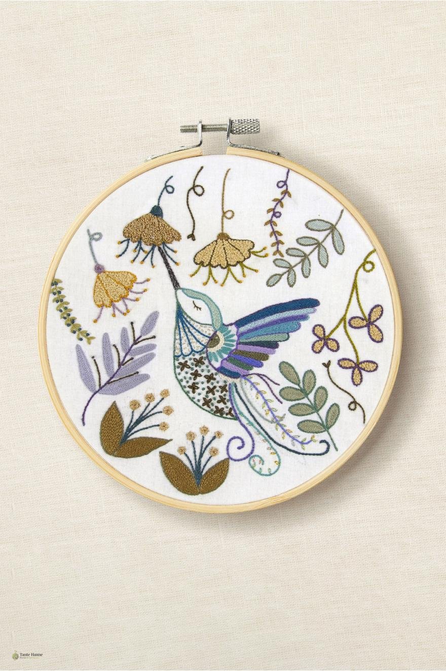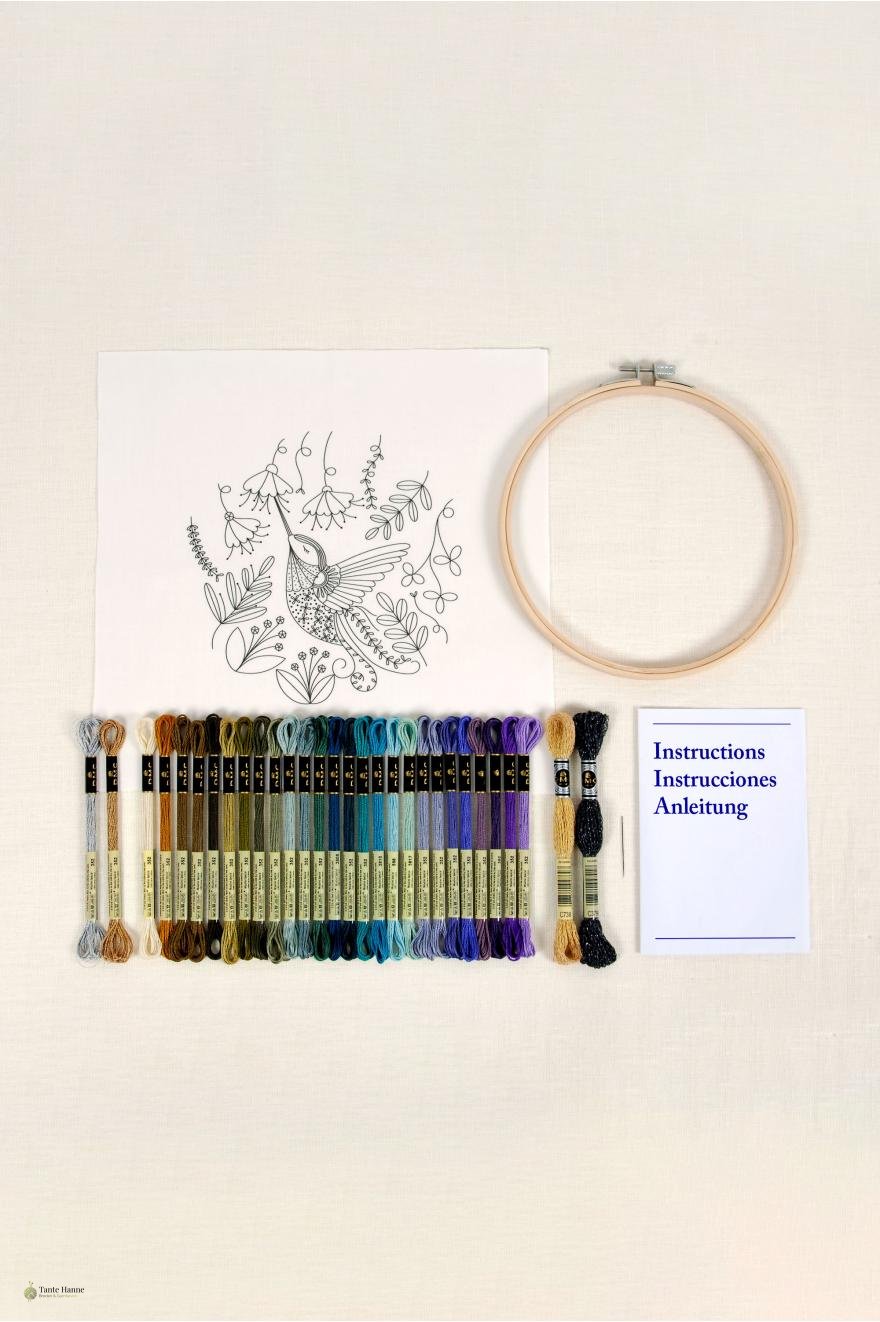 Smukt broderikit fra DMC model Kolibri, størrelse ø 18,5 cm - broderiet er påtrykt stoffet.