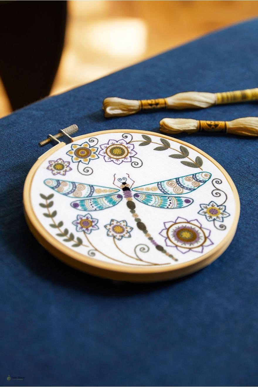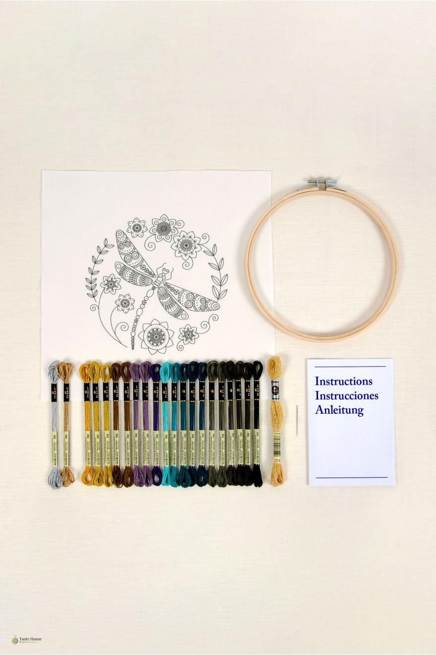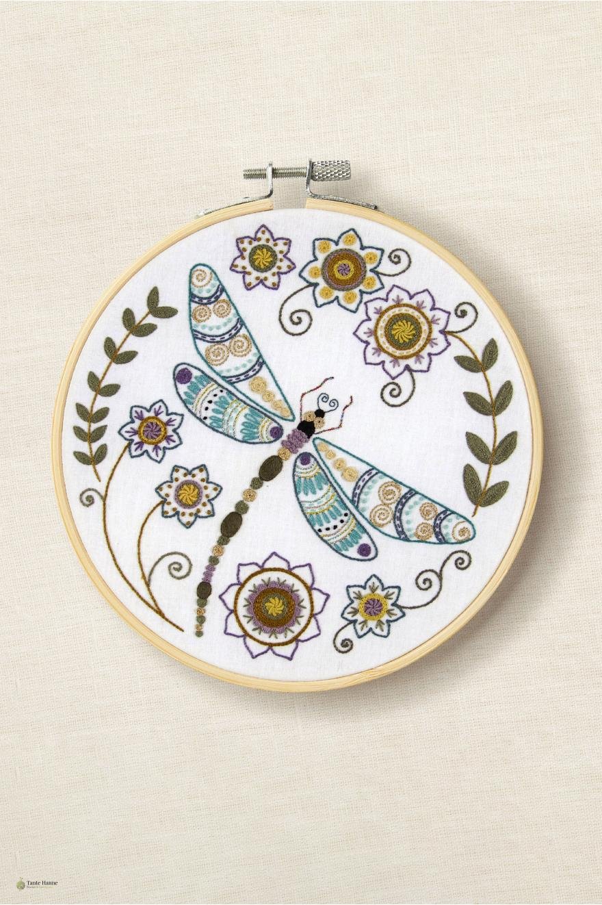 Smukt broderikit fra DMC model DRAGONFLY, størrelse ø 18,5 cm - broderiet er påtrykt stoffet.