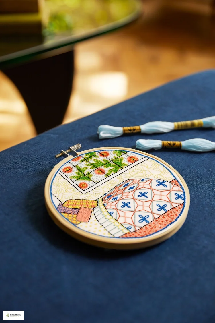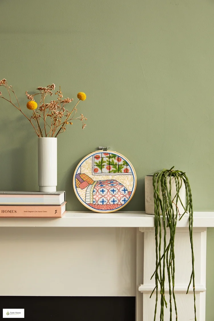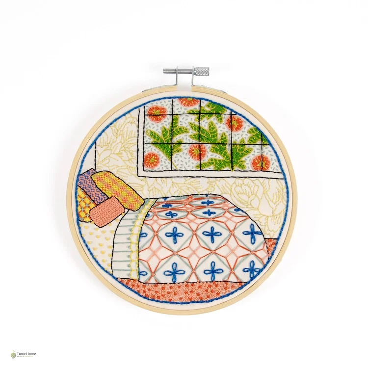 Brug et udvalg af sting til at brodere dette indbydende design fra Karin Fast. De forskellige teksturer og lagdelte print skaber en hyggelig soveværelsesstemning.