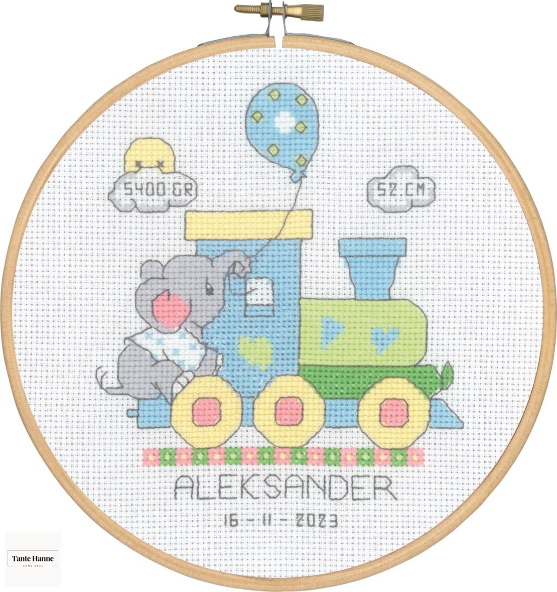 Broderi kit fra Permin med mulighed for at skrive tid, dato, vægt og længde.