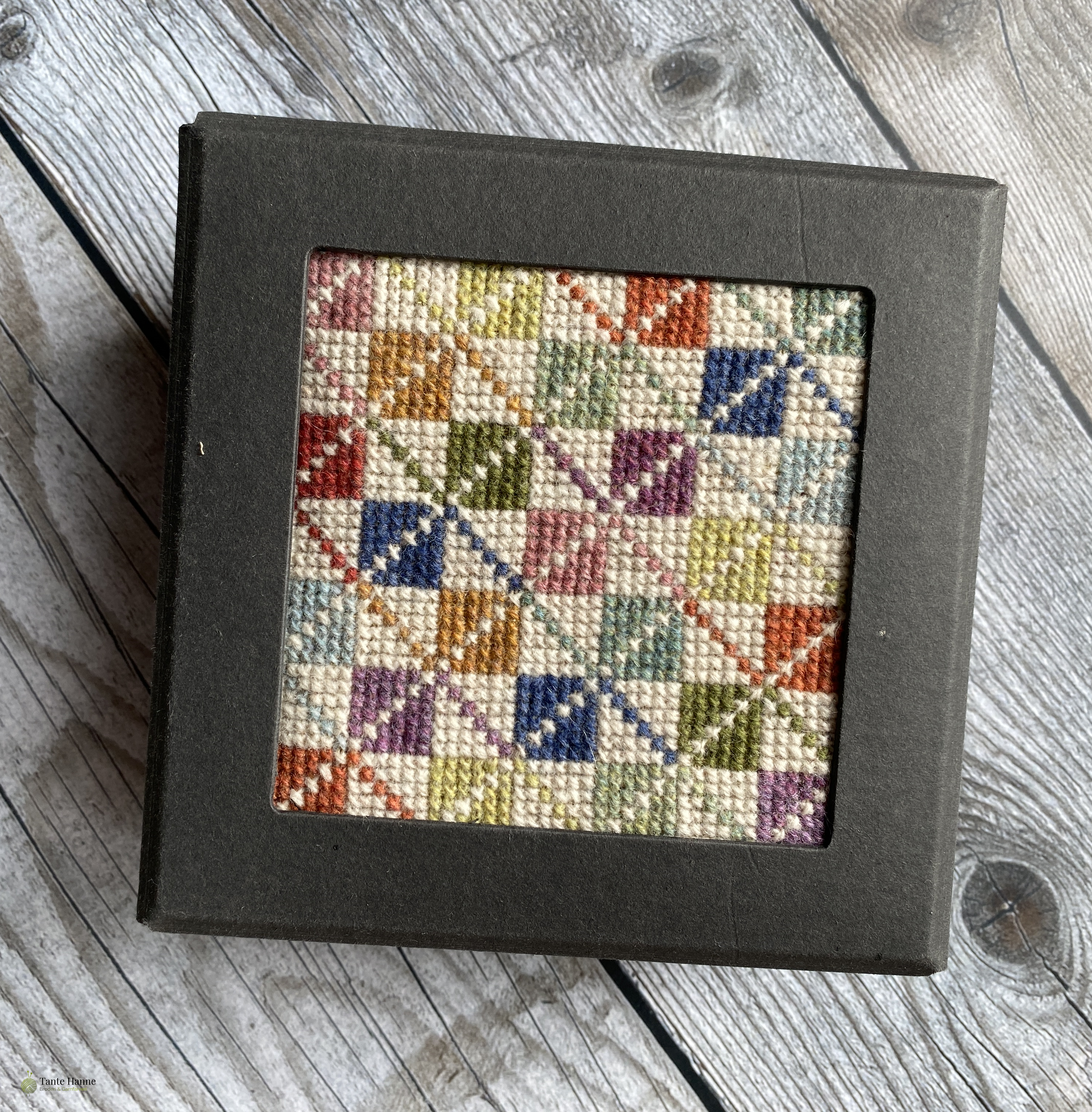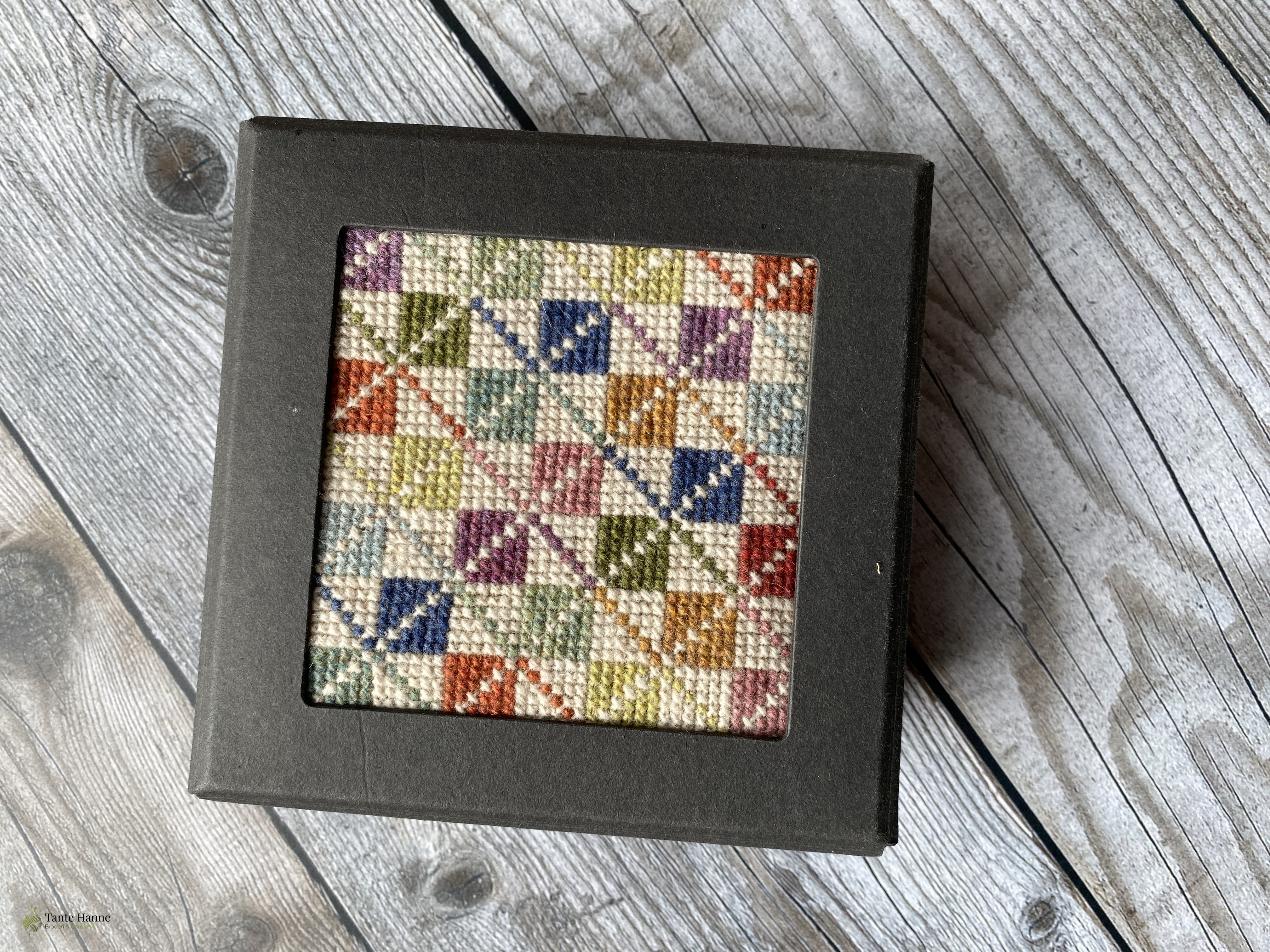 Hvis du ønsker et "forhøjet" udtryk når broderiet er monteret i æsken kan du ligge 2-3 lag engangvaskeklud eller filt under.