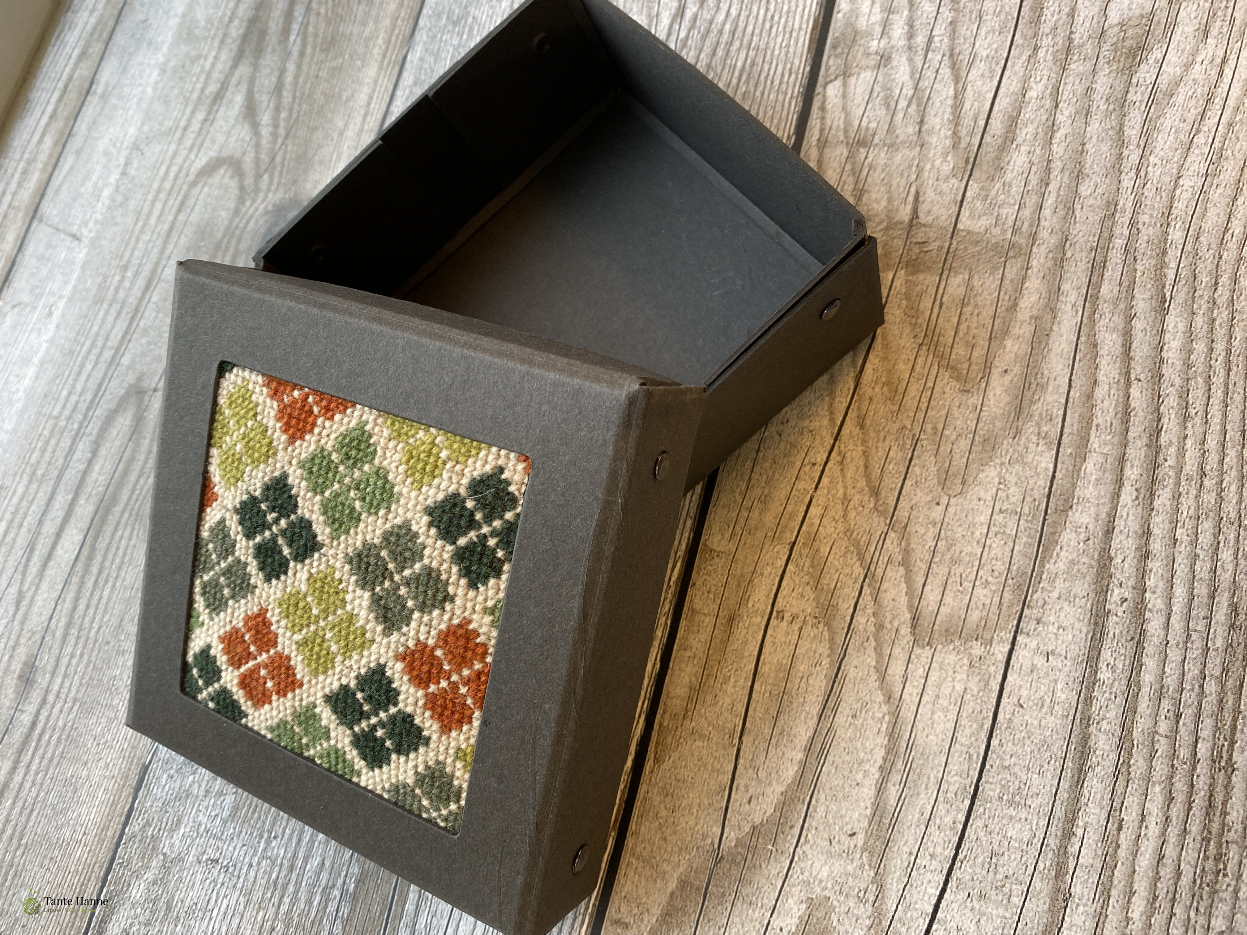 Æske 13,5 x 13,5 x 5 cm, antracitgrå. Æsken er produceret af Bruunshaab gl. Papfabrik (muserum i Viborg)