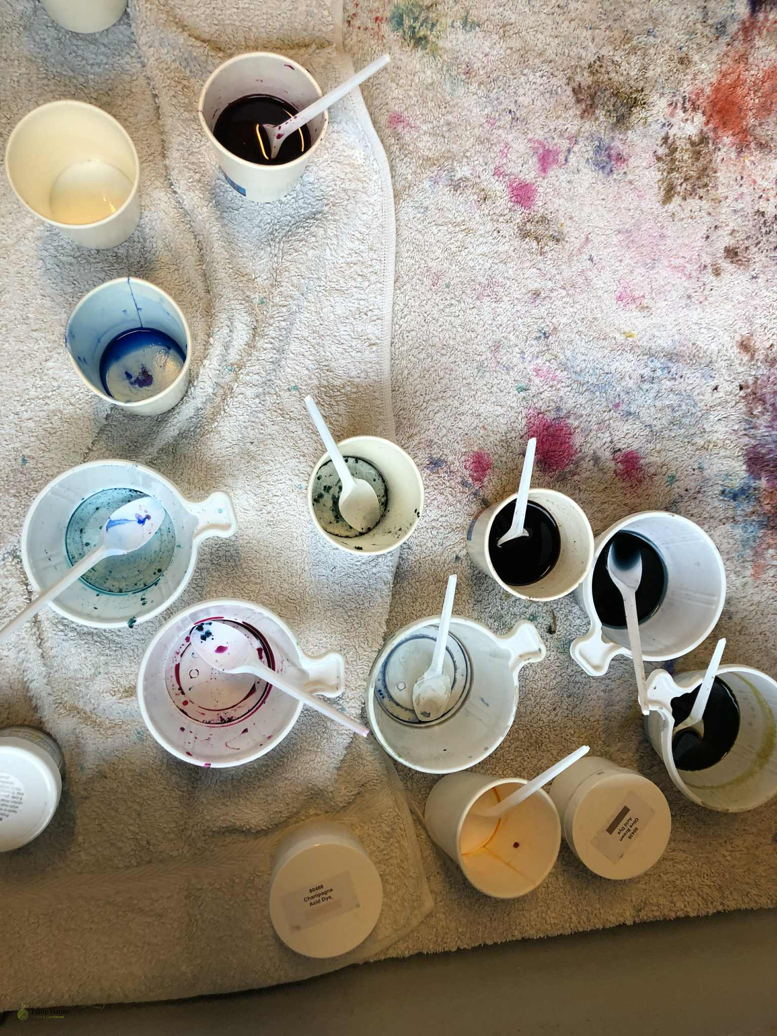 Vi farver med pulverfarver opløst i vand. Farven fikseres ved at garnet gøres ”surt” og med varme.