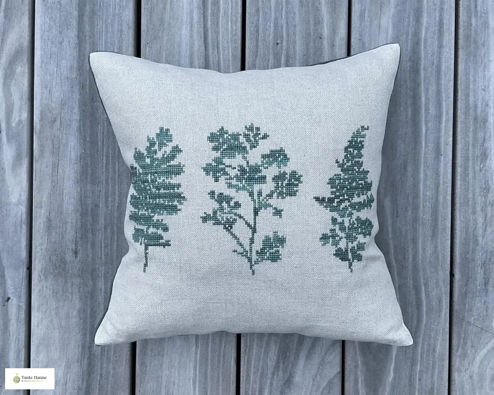 Denne fine pude broderes på smukt naturfarvet hørlærred. Garnet er håndfarvet uld og silke der giver en fine og smuk melering i det ensfarvede broderi.